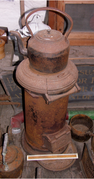 2 “Arctic” stove, purchased new in 1970, with iron kettle. Both used to supply constant heat and hot water in the cabin which I built against one of the windows of the mill and which I lived in for the first five years while I worked on repairs and plans for adapting the mill to my use.